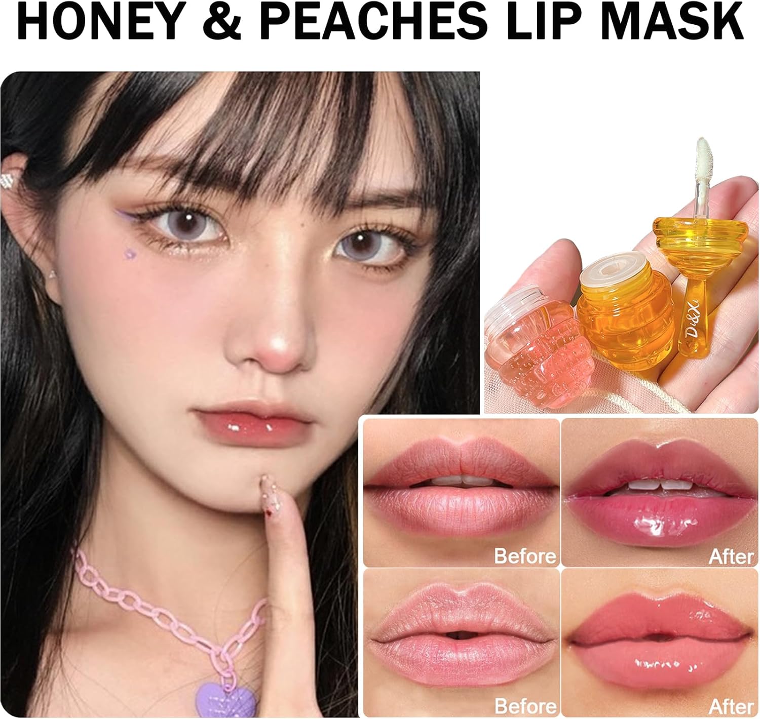 2 PCS Moisturizing Honey Pot Lip Oil Lip Gloss, Natural Honey Sleeping Lip Mask, Lip Balm, Hydrating & Prevention Dry & Cracked Lip Scrubs Exfoliator, Winter Lip Care Products(Peach+Honey)